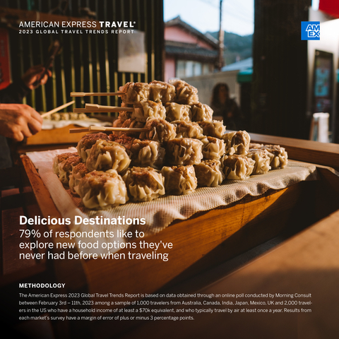 1The American Express 2023 Global Travel Trends Report is based on data obtained through an online poll conducted by Morning Consult between February 3rd – 11th, 2023 among a sample of 1,000 travelers from Australia, Canada, India, Japan, Mexico, UK and 2,000 travelers in the US who have a household income of at least a $70k equivalent, and who typically travel by air at least once a year. Results from each market’s survey have a margin of error of plus or minus 3 percentage points.