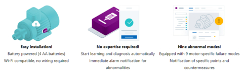 This is an OEM solution from Macnica, consisting of hardware equipped with an ultra-high-precision MEMS sensor developed by Analog Devices, and dedicated software. Hardware installation is performed by attaching a battery-powered sensor to the cooling fin of the motor, and initial settings are configured by the smartphone app. Once in use, AI machine learning is automatically initiated, and an AI model to detect anomalies will be automatically generated after a period. This allows the vibration, temperature, and magnetic field data to be collected by the sensor to be checked via PC, smartphone or tablet with alerts sent in the event of an abnormality.