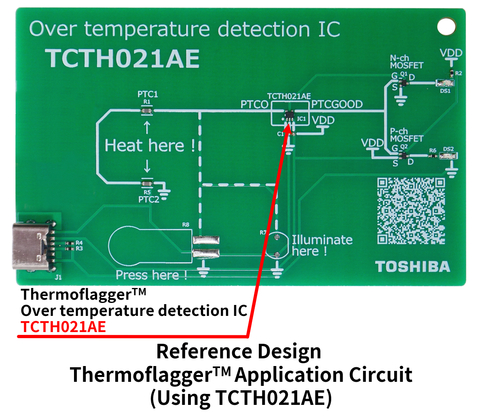 Alongside an already published reference design, the Thermoflagger™ Over-temperature Detection IC Application Circuit (TCTH021BE/Open Drain version), Toshiba has made a new reference design available on its website today: the Thermoflagger™ Over-temperature Detection IC Application Circuit (TCTH021AE/Push-Pull version).