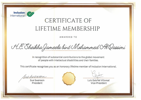 Honorary Lifetime Membership certificate awarded to Sheikha Jameela bint Mohammed Al Qasimi by Inclusion International (Photo: AETOSWire)